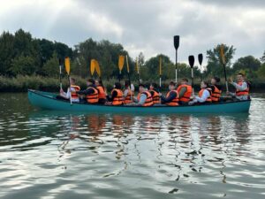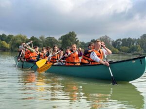 12 személyes, nagyon biztonságos – borulásmentes kenukkal, melybe a gyerekek utcai ruhában melegítőben is beülhetnek.